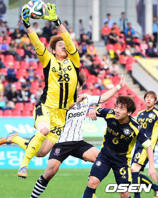 26일 오후 경기도 성남시 탄천종합운동장서 열린 '현대오일뱅크 K리그 클래식 2014' 성남FC와 전남 드래곤즈와의 경기, 전반 성남 박준혁 골키퍼가 골문에서 공을 잡아내고 있다.