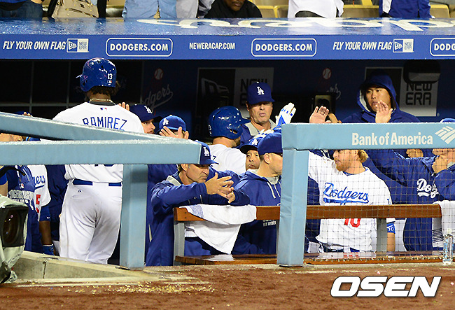 11회말 무사 1루에서 다저스 곤잘레스가 투런포를 날리고 류현진을 비롯한 동료선수들과 더그아웃에서 하이파이브를 하고 있다. /jpnews@osen.co.kr