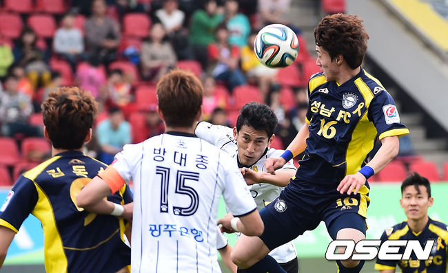 26일 오후 경기도 성남시 탄천종합운동장서 열린 '현대오일뱅크 K리그 클래식 2014' 성남FC와 전남 드래곤즈와의 경기, 후반 성남 황의조가 헤딩슛을 시도하고 있다.