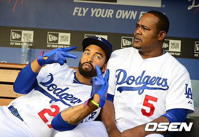 경기에 앞서 맷 켐프와 유리베가 더그아웃에 앉아 포즈를 취하고 있다. /jpnews@osen.co.kr