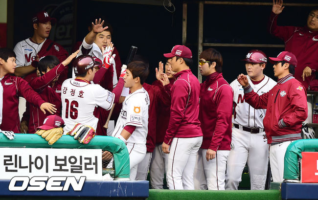 26일 오후 서울 목동구장에서 열린 '2014 한국야쿠르트 세븐 프로야구' 넥센 히어로즈와 삼성 라이온즈의 경기, 2회말 1사 주자 없는 상황에서 좌월 솔로 홈런을 날린 넥센 강정호가 덕아웃에서 동료들로 부터 환영을 받고 있다.