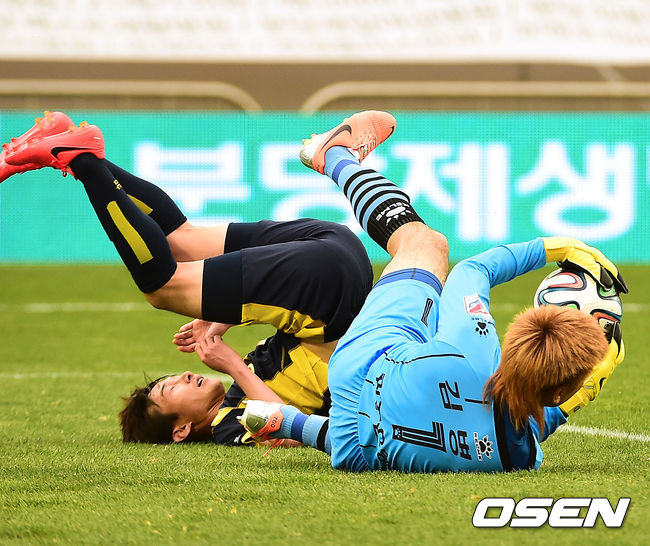 26일 오후 경기도 성남시 탄천종합운동장서 열린 '현대오일뱅크 K리그 클래식 2014' 성남FC와 전남 드래곤즈와의 경기, 후반 전남 김병지 골키퍼가 성남 김철호의 헤딩에 앞서 공을 잡아내고 있다.
