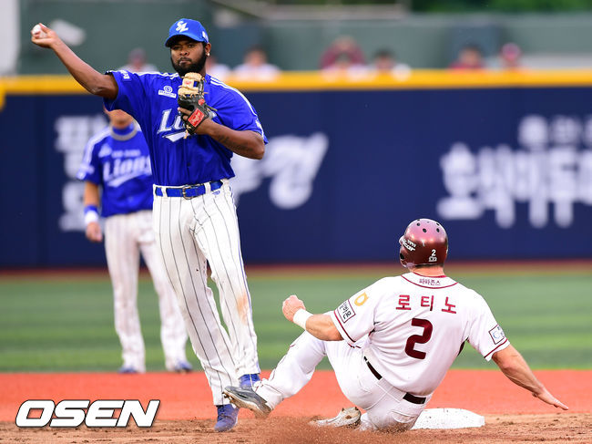 26일 오후 서울 목동구장에서 열린 '2014 한국야쿠르트 세븐 프로야구' 넥센 히어로즈와 삼성 라이온즈의 경기, 2회말 1사 1,2루 넥센 이성열의 유격수 앞 땅볼때 1루 주자 로티노가 2루에서 포스아웃 되고 있다. 삼성 2루수는 나바로.
