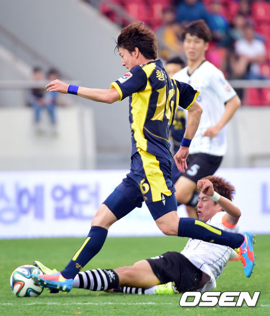 26일 오후 경기도 성남시 탄천종합운동장서 열린 '현대오일뱅크 K리그 클래식 2014' 성남FC와 전남 드래곤즈와의 경기, 후반 성남 황의조가 태클을 피해 드리블을하고 있다.