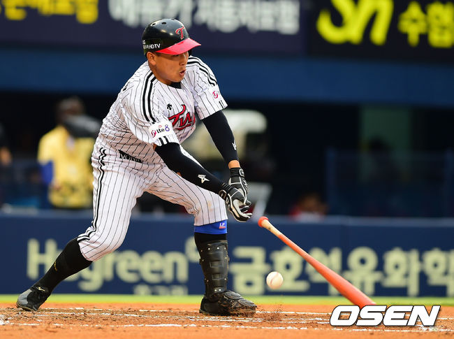 2회말 1사 1루 LG 윤요섭이 타격을 하다 배트를 놓치고 있다.
