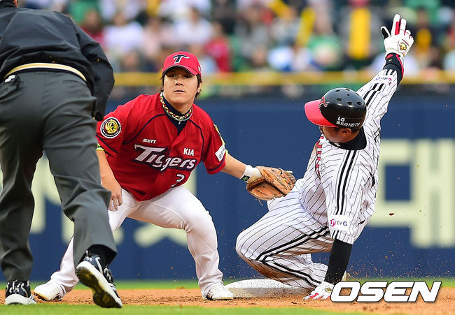 2회말 2사 1루 LG 이병규가 투수 홀튼의 폭투를 틈타 2루에 들어가려다 아웃당하고 있다.