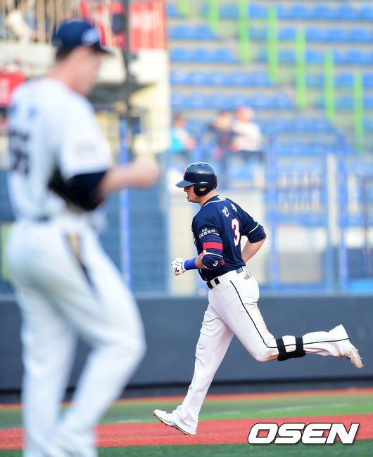 4회초 무사에서 두산 칸투가 좌월 솔로 홈런을 날리고 그라운드를 달리고 있다.