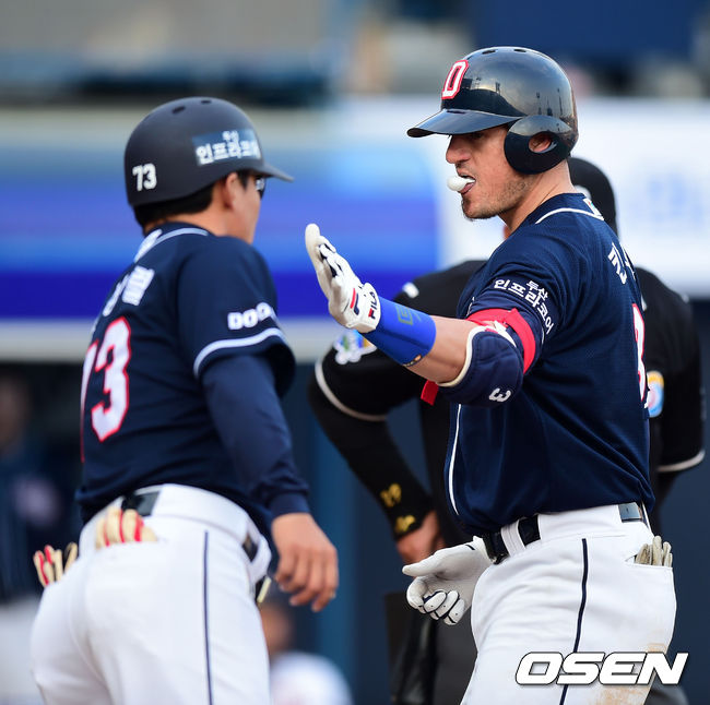 4회초 무사에서 두산 칸투가 좌월 솔로 홈런을 날리고 홈에서 전상렬 코치와 하이파이브를 하고 있다.