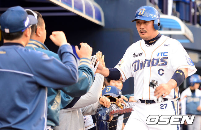 4회말 1사 2,3루에서 NC 권희동의 희생플라이 때 홈을 밟은 3루주자 이호준이 더그아웃에서 동료들과 하이파이브를 하고 있다.