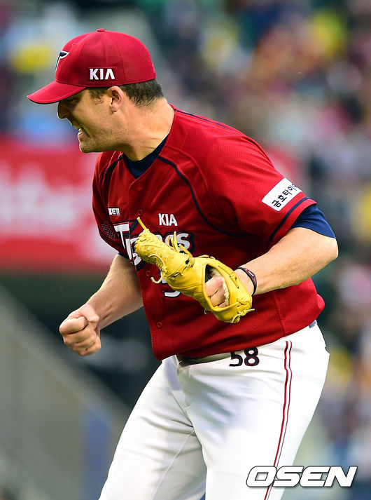 5회말 무사 만루 KIA 홀튼이 LG 박용택을 2루 앞 땅볼로 유도하였지만 김선빈의 송구 실책으로 실점하자 아쉬워하고 있다.