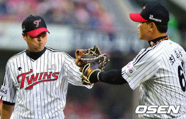 6회초 1사 1루 LG 우규민이 KIA 김원섭을 병살로 잡아낸 뒤 최승준과 기뻐하고 있다.