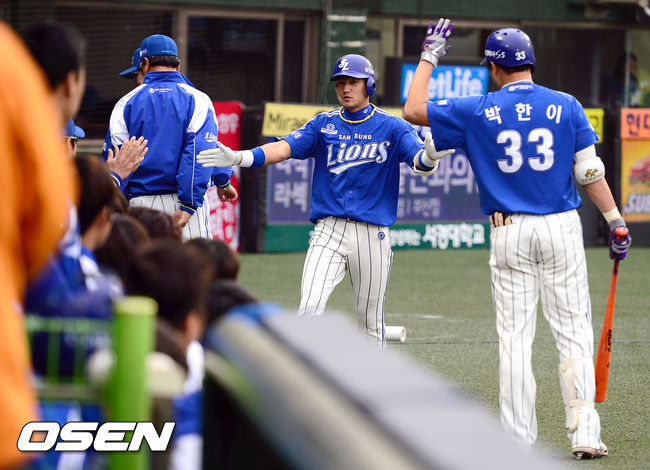 26일 오후 서울 목동구장에서 열린 '2014 한국야쿠르트 세븐 프로야구' 넥센 히어로즈와 삼성 라이온즈의 경기, 3회초 1사 좌월 솔로 홈런을 날린 삼성 김상수가 덕아웃에서 동료들과 하이파이브를 나누고 있다.