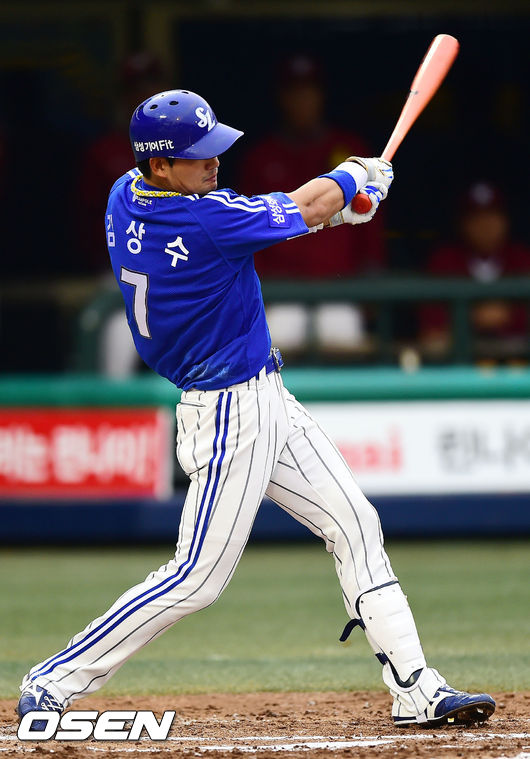 26일 오후 서울 목동구장에서 열린 '2014 한국야쿠르트 세븐 프로야구' 넥센 히어로즈와 삼성 라이온즈의 경기, 3회초 1사 삼성 김상수가 좌월 솔로 홈런을 날리고 있다.