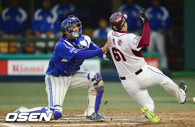 26일 오후 서울 목동구장에서 열린 '2014 한국야쿠르트 세븐 프로야구' 넥센 히어로즈와 삼성 라이온즈의 경기, 6회 말 2사 1,3루에서 넥센 1루 주자 유한준이 이택근의 적시타로 홈까지 뛰어들었으나 삼성 포수 이흥련에 태그아웃되고 있다.