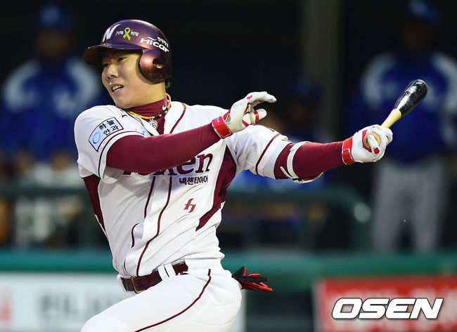26일 오후 서울 목동구장에서 열린 '2014 한국야쿠르트 세븐 프로야구' 넥센 히어로즈와 삼성 라이온즈의 경기, 7회말 무사 넥센 강정호가 좌익수 앞 2루타를 날리고 있다.