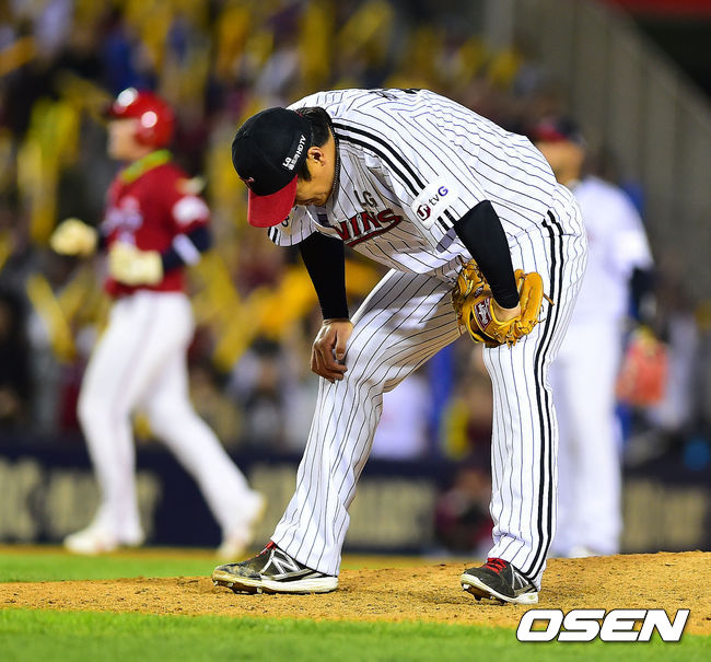 8회초 2사 만루 LG 정현욱이 KIA 김원섭에게 밀어내기 볼넷을 허용한 뒤 아쉬워하고 있다.