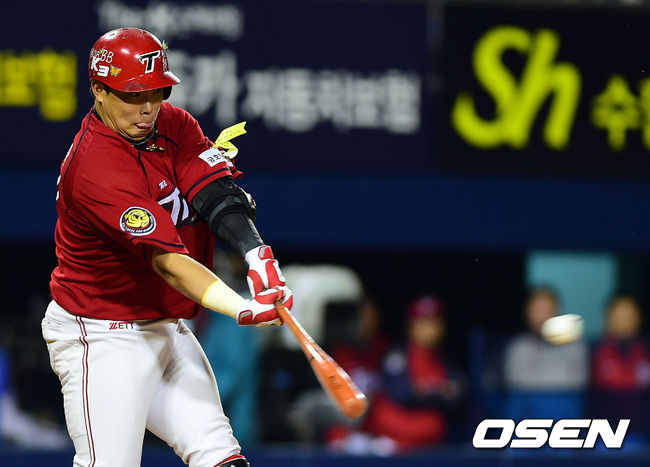 8회초 2사 만루 KIA 나지완이 2타점 적시타를 때리고 있다.