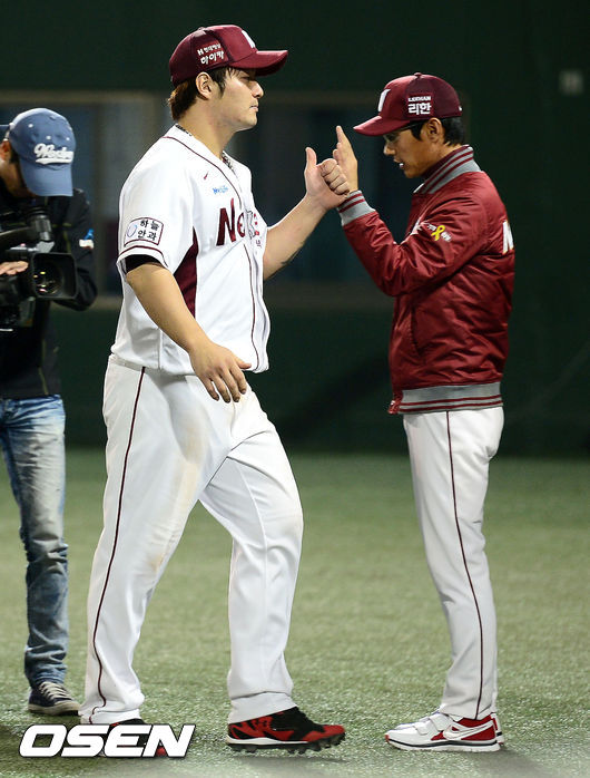 경기종료, 승리한 넥센 염경엽감독과 박병호가 기쁨의 인사를 나누고 있다. /ouxou@osen.co.kr