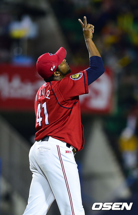 9회말 2사 KIA 어센시오가 LG 윤요섭을 3루 땅볼로 잡아낸 뒤 세레머니를 하고 있다.