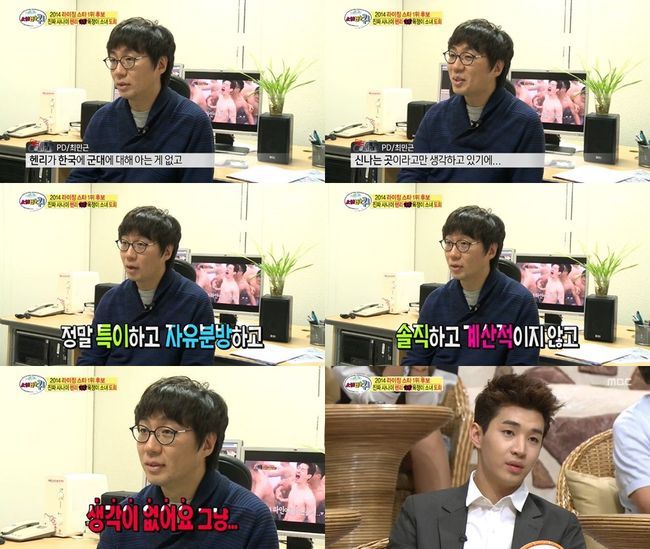 최민근 PD는 "헨리가 한국 군대에 대해 아는 게 없고 신나는 곳이라고만 생각하고 있기에 설마 했는데 진짜 그렇게 생각하고 왔더라"며 "정말 특이하고 자유분방하고 솔직하고 계산적이지 않다"라고 말했다.