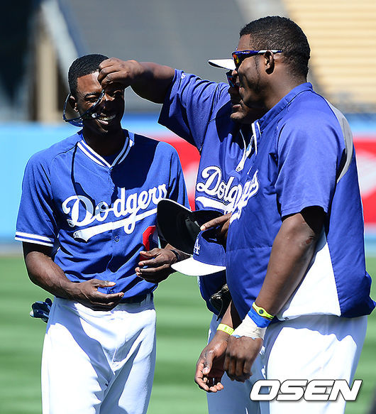 경기에 앞서 다저스 유리베가 고든과 푸이그의 고글을 벗기고 동료선수들에게 누가 더 나이 많아 보이는지 묻고 있다. 디 고든은 88년생, 야시엘 푸이그는 90년생이다.