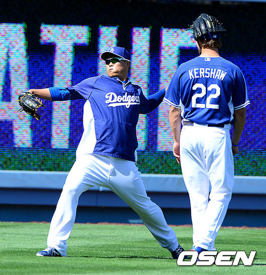 경기에 앞서 다저스 류현진이 커쇼가 지켜보는 가운데 캐치볼을 하고 있다. 클레이튼 커쇼는 26일 재활경기등판에서 합격점을 받았다. 마이너리그 싱글A 랜초쿠카몽가에서 랭커스터를 상대로 재활등판에 나선 커쇼는 5이닝 동안 모두 56개의 볼을 던지며 2안타 볼넷 1개로 1실점(1자책점) 하는 좋은 투구내용을 보였다. 삼진은 6개를 솎아냈다.