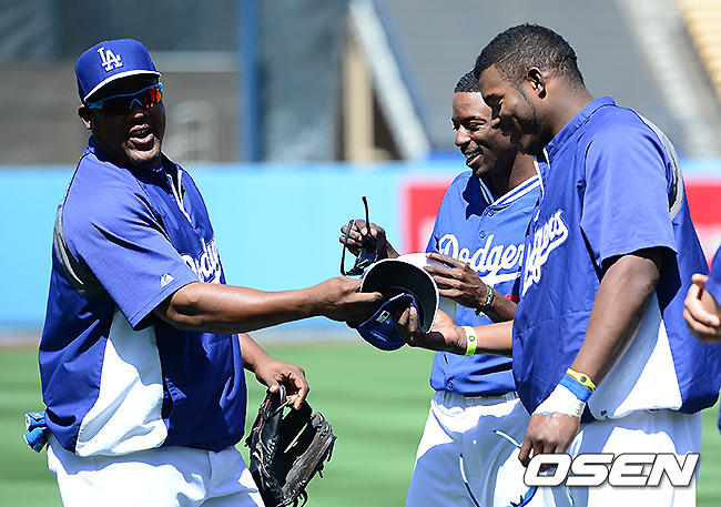 웃을 수도 없고 왠지 씁쓸한 푸이그, 콜로라도 전을 앞둔 다저스의 즐거운 훈련 모습이였다. /jpnews@osen.co.kr
