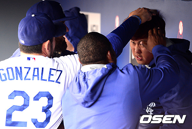 경기에 앞서 다저스 류현진이 유리베와 장난 도중 더그아웃 천장에 머리를 부딪히자 반 슬라이크, 곤잘레스가 만져주고 있다.