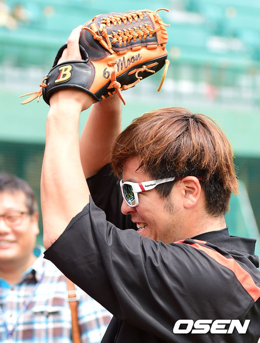 경기에 앞서 롯데 강민호가 문규현의 글러브를 착용하고 미소를 짓고 있다.