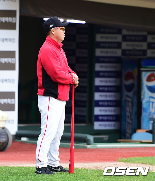 경기에 앞서 SK 이만수 감독이 훈련 중인 선수들을 바라보고 있다.