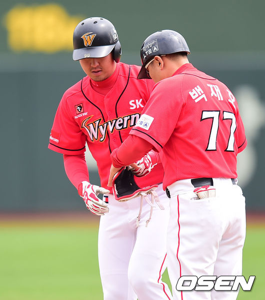 1회초 1사 2루에서 SK 최정이 우전 적시타를 치고 백재호 코치에게 보호대를 건네고 있다.