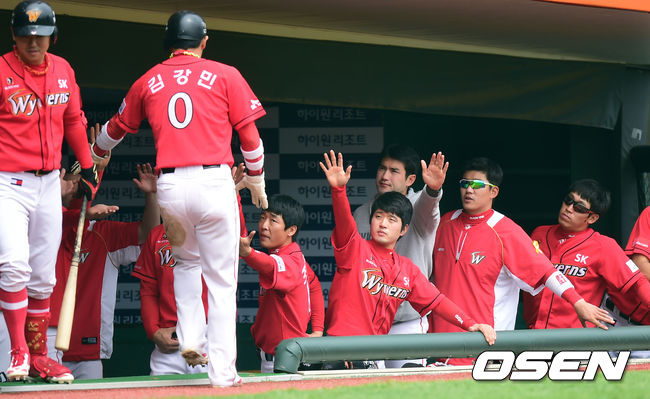 1회초 1사 2루에서 SK 최정의 우전 적시타때 홈을 밟은 2루주자 김강민이 더그아웃에서 동료들과 하이파이브를 하고 있다.