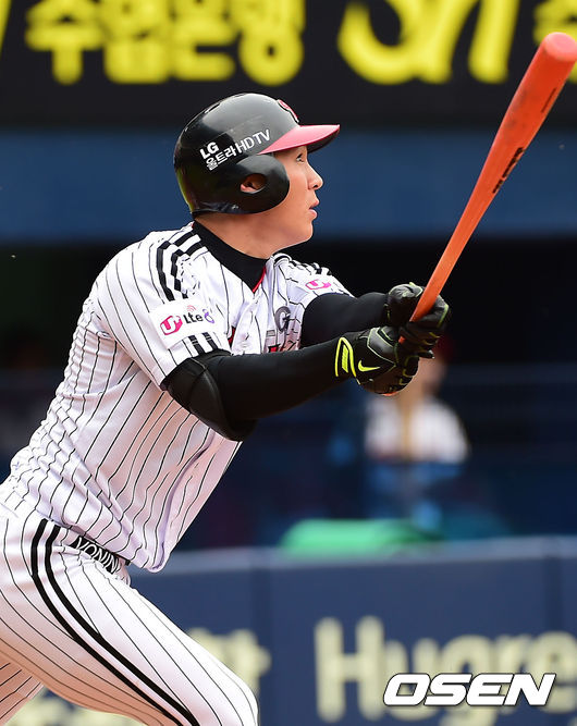 27일 오후 서울 잠실야구장에서 열린 ‘2014 한국야쿠르트 세븐 프로야구’ LG 트윈스와 KIA 타이거즈의 경기, 2회말 2사 주자 만루 오지환이 중견수 플라이 타구를 날리고 있다.