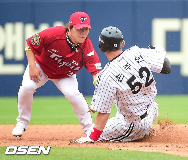 27일 오후 서울 잠실야구장에서 열린 ‘2014 한국야쿠르트 세븐 프로야구’ LG 트윈스와 KIA 타이거즈의 경기, 3회말 1사 주자 1루 LG 조쉬벨 타석에서 1루 주자 손주인이 2루 도루를 시도, KIA 유격수 김선빈이 2루에서 손주인을 태그아웃 시키고 있다.