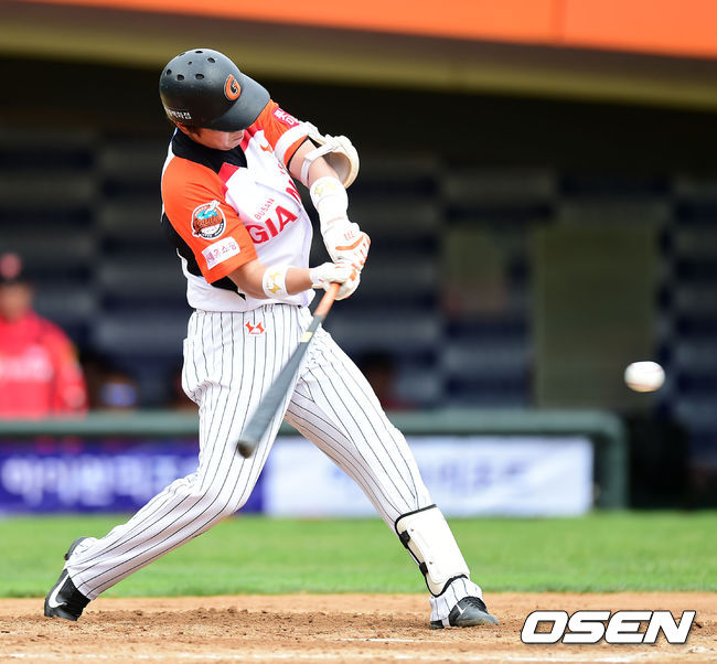 3회말 1사 1,2루에서 롯데 정훈이 2타점 좌전 적시 2루타를 치고 있다.