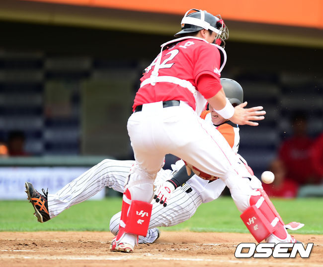 3회말 1사 1,2루에서 롯데 정훈의 2타점 좌전 적시 2루타때 1루주자 김민하가 홈으로 쇄도하고 있다.