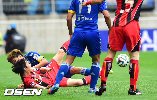 27일 오후 수원 월드컵경기장에서 열린 '현대오일뱅크 K리그 클래식 2014' 수원 삼성과 FC 서울의 경기 전반 수원 서정진과 볼다툼을 하던 서울 김치우가 넘어지고 있다.