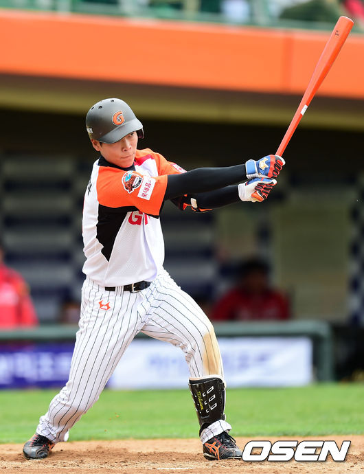 5회말 1사에서 롯데 김민하가 중전안타를 치고 있다.