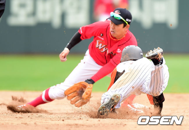 5회말 1사 1루에서 롯데 정훈 타석때 1루주자 김민하가 도루를 시도하고 있다.