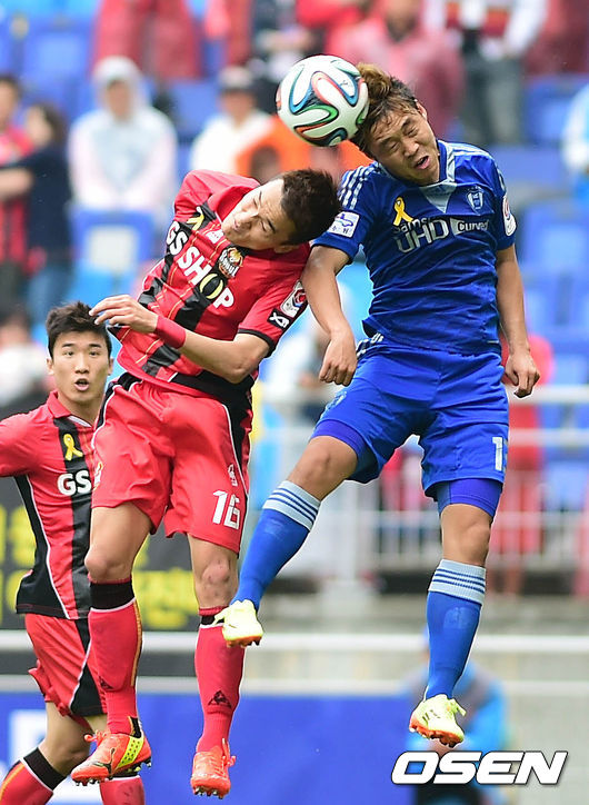 27일 오후 수원 월드컵경기장에서 열린 '현대오일뱅크 K리그 클래식 2014' 수원 삼성과 FC 서울의 경기 후반 강승조와 서정진이 공중볼 다툼을 하고 있다.