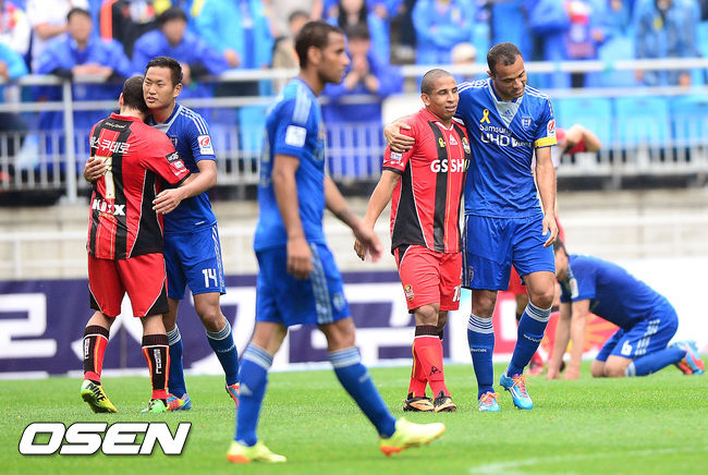 27일 오후 수원 월드컵경기장에서 열린 '현대오일뱅크 K리그 클래식 2014' 수원 삼성과 FC 서울의 경기 종료 후 승리한 FC선수들과 수원 삼성 선수들이 인사를 나누고 있다.