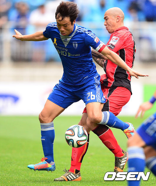 27일 오후 수원 월드컵경기장에서 열린 '현대오일뱅크 K리그 클래식 2014' 수원 삼성과 FC 서울의 경기 후반 수원 염기훈과 서울 차두리가 볼다툼을 하고 있다.
