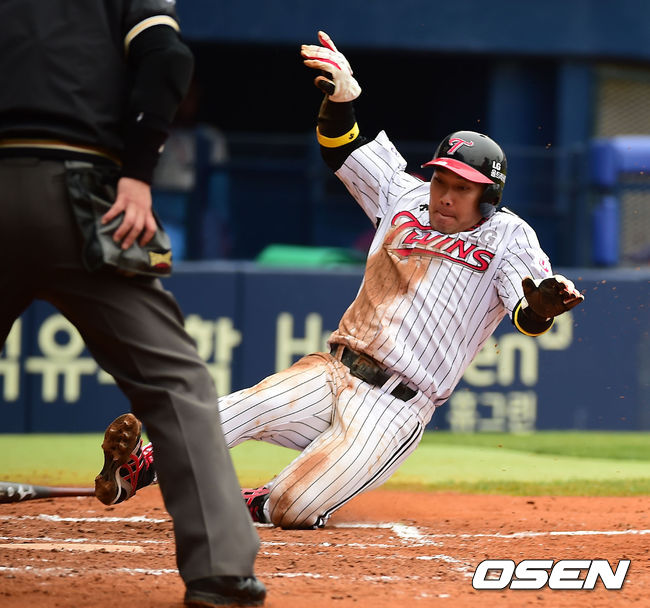 27일 오후 서울 잠실야구장에서 열린 ‘2014 한국야쿠르트 세븐 프로야구’ LG 트윈스와 KIA 타이거즈의 경기, 8회말 1사 주자 2루 LG 정의윤이 좌익수 앞 1타점 동점 적시타때 2루 주자 박용근이 홈으로 몸을 날려 세이프 되고 있다.