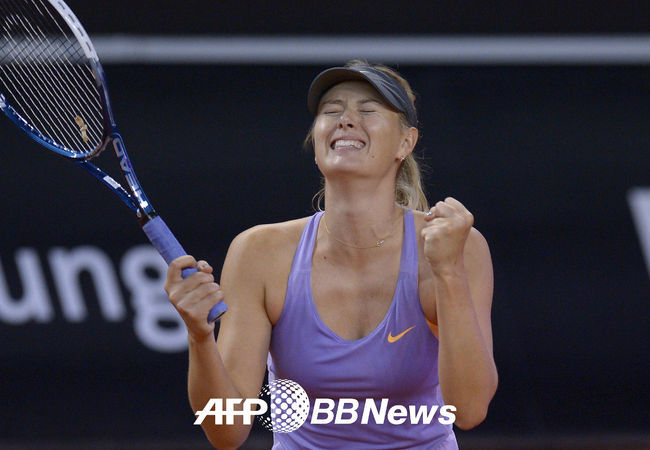 [OSEN=사진팀] 27일(현지시간) 독일 슈투트가르트에서 벌어진 WTA 투어 포르셰 그랑프리(총상금 71만 달러) 단식 결승 마리아 샤라포바(러시아)와 아나 이바노비치(세르비아)경기서 샤라포바가 2-1로 역전승을 거두고 환호하고 있다.