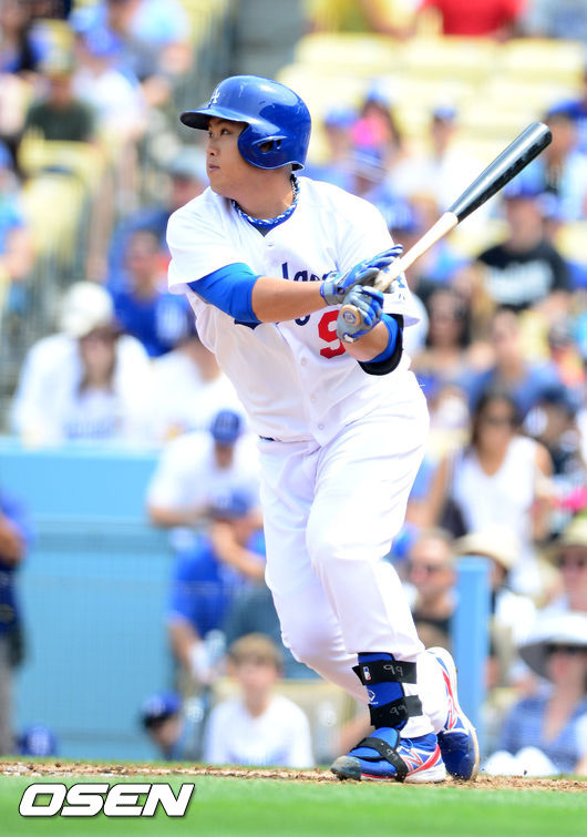 2회말 2사 주자 1루 다저스 선발 류현진이 중전 안타를 날리고 있다.