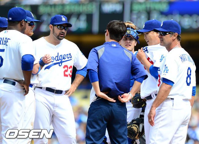 6회초 무사 주자 2,3루 콜로라도 러틀러지에게 좌월 스리런 홈런을 맞은 다저스 선발 류현진이 교체되면 말을 하고 있다./jpnews@osen.co.kr