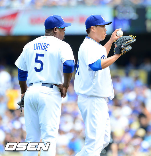 3회초 1사 주자 없는 상황에서 다저스 선발 류현진이 콜로라도 모어노의 땅볼 타구를 잡아낸 후 3루수 후안 유리베와 얘기를 나누고 있다. /jpnews@osen.co.kr
