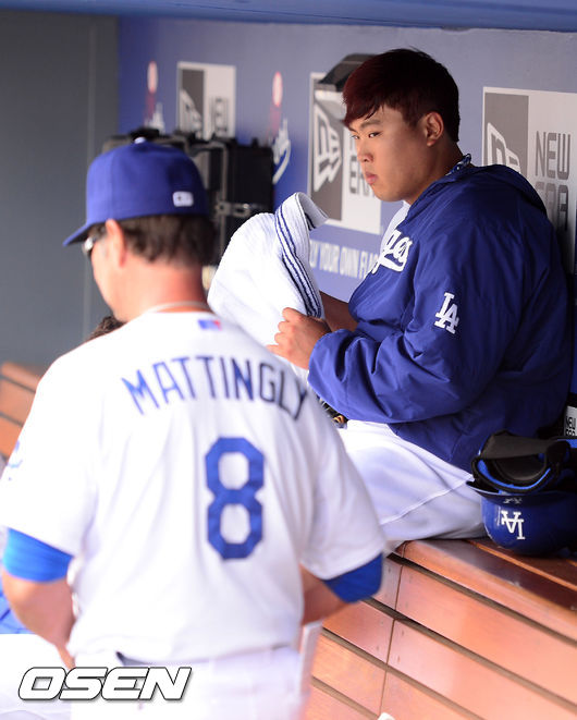5회를 마친 다저스 류현진이 돈 매팅리 감독을 바라보고 있다. /jpnews@osen.co.kr