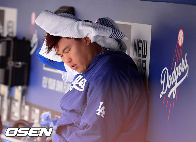 6회초 무사 주자 2,3루 콜로라도 러틀러지에게 좌월 스리런 홈런을 맞은 다저스 선발 류현진이 교체된 후 덕아웃에서 땀을 닦고 있다. /jpnews@osen.co.kr