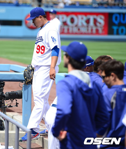 5회초를 마친 다저스 선발 류현진이 고개를 숙인채 덕아웃으로 향하고 있다. /jpnews@osen.co.kr